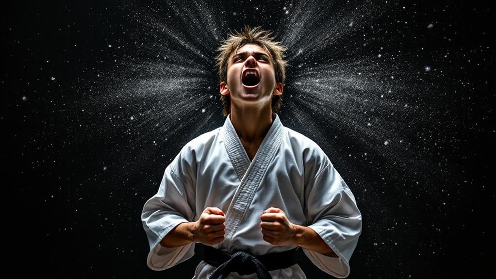 You might think that powerful yell you hear in Taekwondo class is just for show, but I’ve discovered it’s actually a fascinating scientific tool for building mental strength. When you practice kihap, your body triggers robust physiological responses, from anxiety reduction through parasympathetic activation to motor cortex stimulation. I’ve seen firsthand how this simple technique transforms nervous students into confident warriors. This vocal practice aligns perfectly with mental visualization techniques to create a powerful foundation for emotional self-regulation during intense training moments. Developing combative intuition through consistent practice helps martial artists maintain clarity under pressure while executing complex techniques.