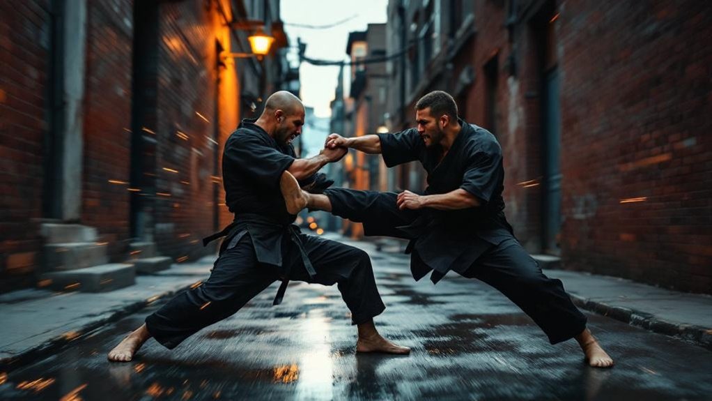 Throughout my years teaching self-defense, I’ve discovered that not all martial arts are created equal in the context of real-world protection. When examining civilian safety protocols, Krav Maga and BJJ stand out as particularly effective systems. With over 500,000 practitioners training in Krav Maga across the United States, its effectiveness for self-defense is well-established. Choosing a school with certified instructors is crucial for learning proper self-defense techniques. Using proper gear selection during training helps prevent injuries while mastering defensive moves. You’ll want to contemplate legal considerations for self-defense too – that’s where Danzan Ryu Jujitsu’s non-lethal control techniques become indispensable. Each art has its strengths.